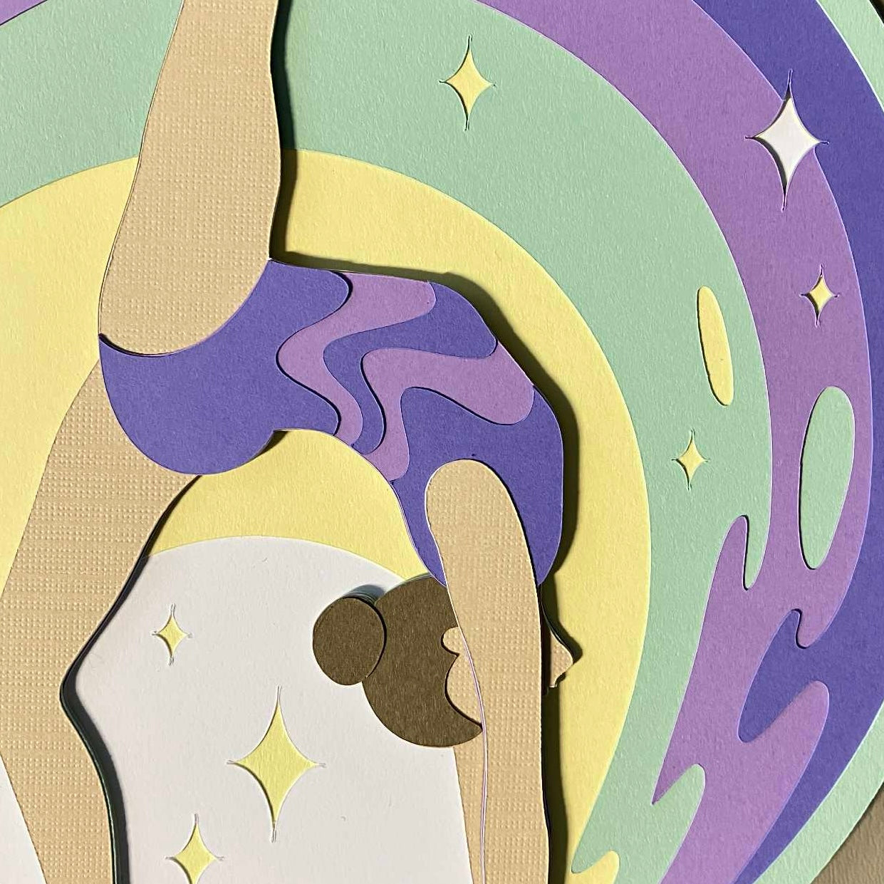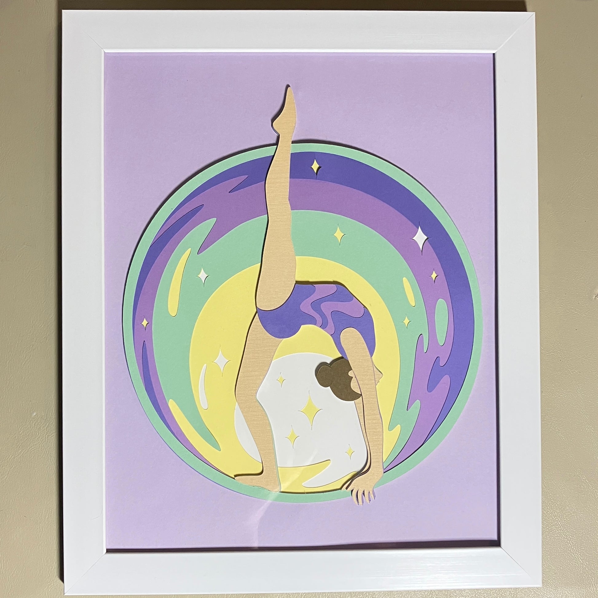 This layered gymnast is made up in a variety of purples, green, pink and yellow. It is mounted on a lighter purple in a white 8x10 frame that can stand alone or hang on a wall. This is perfect for any gymnast. It can be personalized upon request.